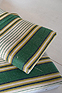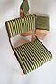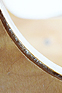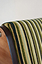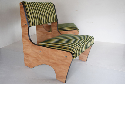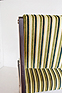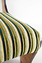 ご自身で張られたという茶系の張り地を剥がすとオリジナルの緑系の張り地が。それをイメージした緑のストライプ調の柄で張り直しをし、シートを固定したネジを受ける木部が駄目になっていたので、修復と補強。それと木部周囲の小口をカバーしていた茶色いプラスチック製テープが全体的に痛みと破損があったので、撤去して修復と塗装を施した。